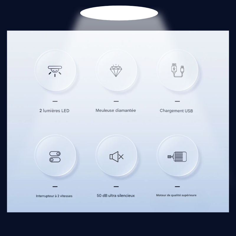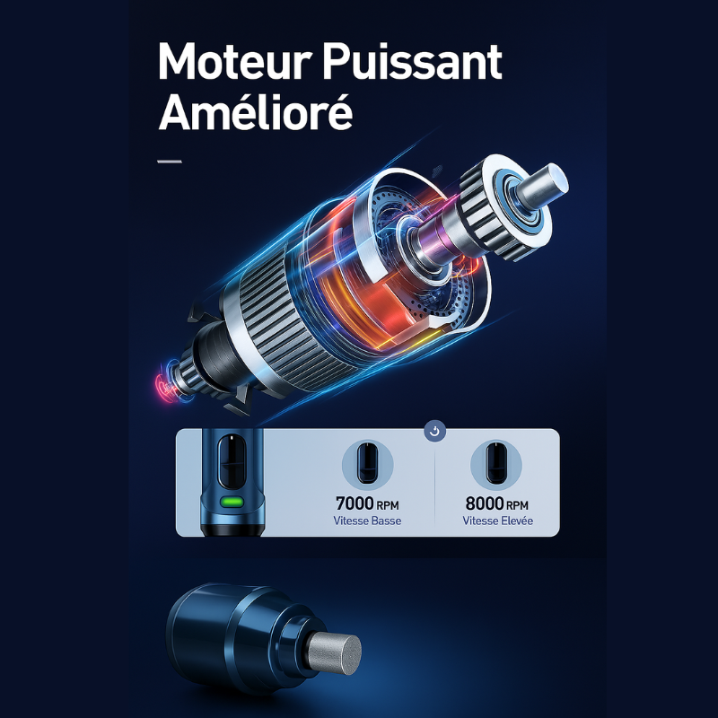 - Double vitesse de meulage : deux niveaux de rotation (7 000 et 8 000 tr/min) adaptés aux ongles clairs et foncés, garantissant une coupe précise et efficace.