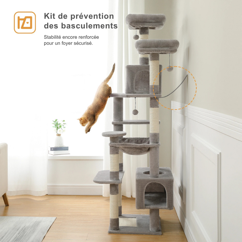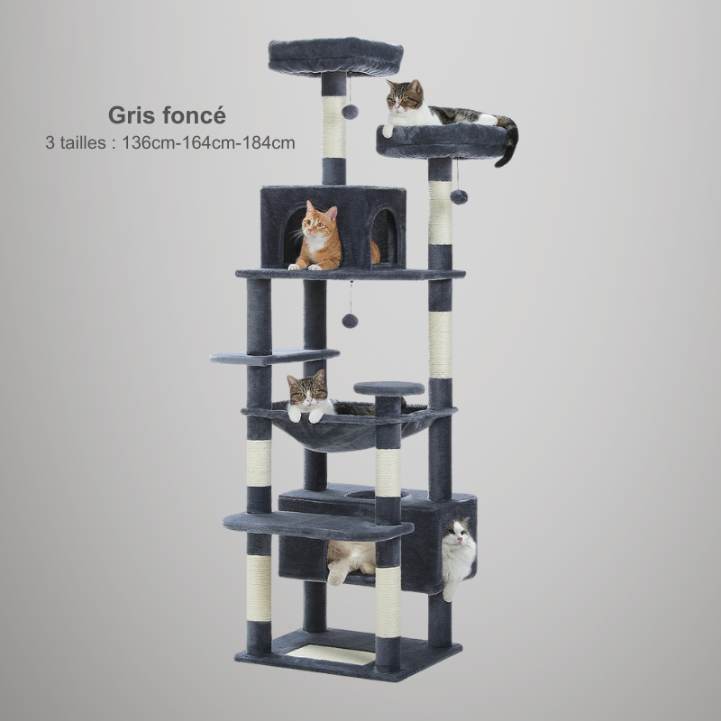 - Quelle que soit la taille choisie, chaque modèle propose une structure solide et stable, des condos extra-larges, des perchoirs confortables, un hamac ultra résistant, et des poteaux en sisal naturel, cet arbre répond aux besoins essentiels des chats : grimper, faire leurs griffes, jouer, se cacher, et se reposer en hauteur.