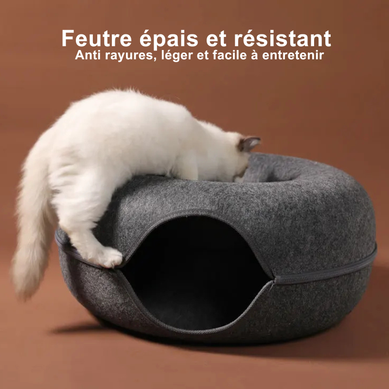 Lit tunnel modulable en forme de donut pour chat : le cocon parfait pour dormir, se cacher ou jouer à deux.